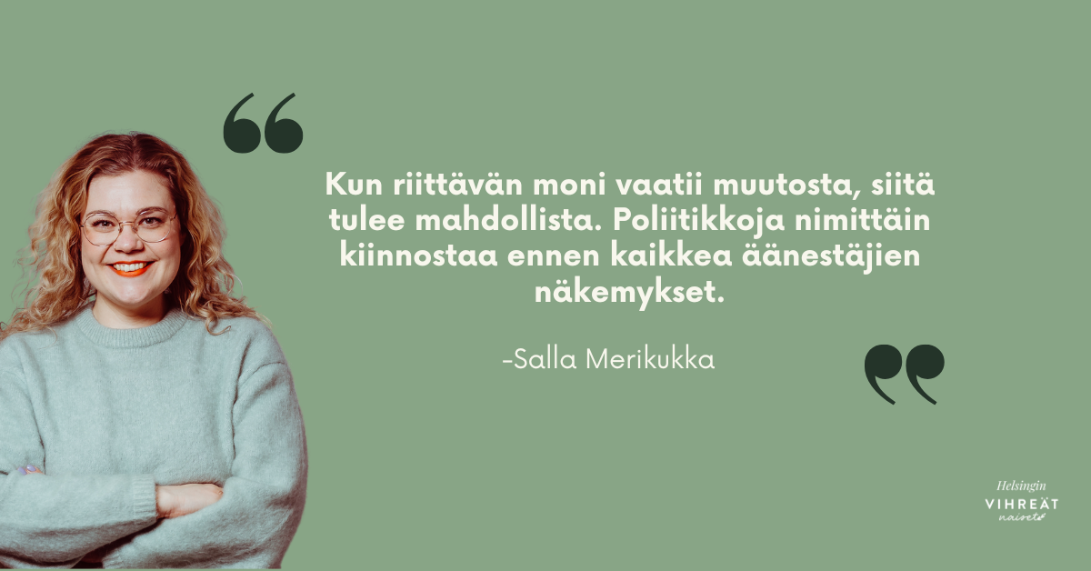 Kirjoittaja on Kalasatamassa asuva Halvempi HSL heti! -kuntalaisaloitteen perustaja, Helsingin Vihreiden Naisten jäsen sekä vihreiden pitkäaikainen aktiivi, joka on toiminut aiemmin mm. Vihreiden nuorten pääsihteerinä, Helsingin Vihreiden puheenjohtajana sekä puoluehallituksessa.