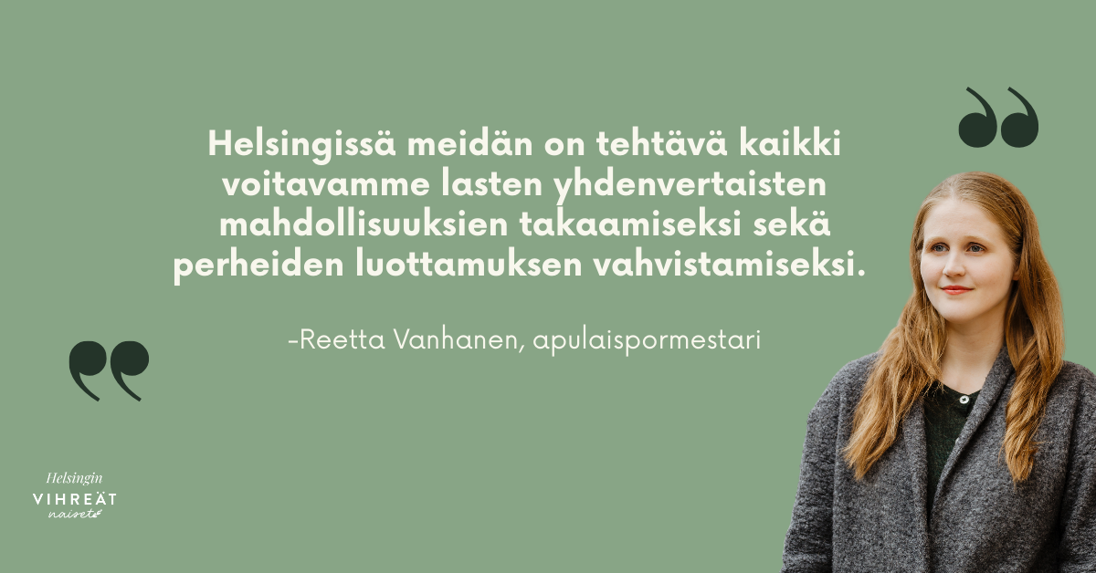 Helsingissä meidän onkin tehtävä kaikki voitavamme lasten yhdenvertaisten mahdollisuuksien takaamiseksi sekä perheiden luottamuksen vahvistamiseksi. Onnistuimme neuvottelemaan kaupunkistrategiaan lapsia, nuoria ja koulutusta priorisoivan talousratkaisun: koulutukseen ei kohdistu enää mekaanista tuottavuustavoitetta, mikä takaa aiempaa vahvemman perusrahoituksen. Lisäksi päätimme merkittävistä panostuksista peruskoulun vahvistamiseksi.
