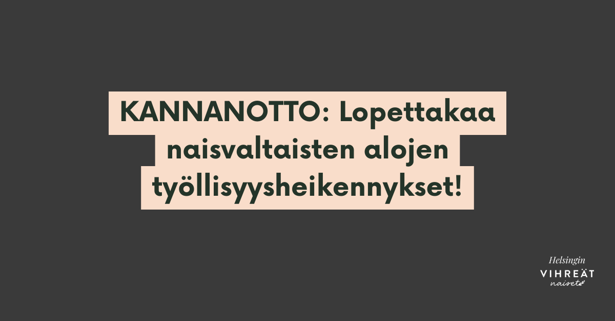 Hallitus on ajanut Suomen kaikkien aikojen ennätystyöttömyyteen ja tehnyt valtavasti hallaa erityisesti naisten työllisyydelle. Helsingin Vihreät Naiset vaatii hallitusta arvioimaan politiikkatoimiensa sukupuolivaikutuksia ja lopettamaan tasa-arvoheikennykset välittömästi. Naisasia on edelleen koko ihmiskunnan asia, eikä sitä tule unohtaa.