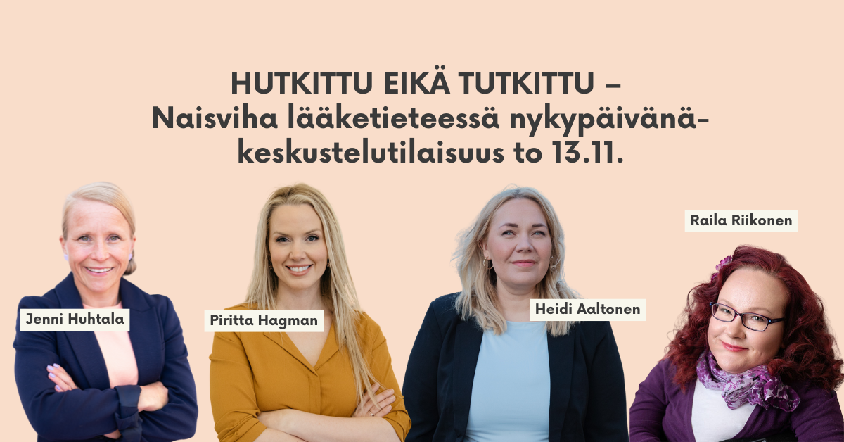Näistä aiheista keskustelemme yhdessä aiheiden asiantuntijoiden kanssa torstaina 13.11. järjestettävässä Hutkittu eikä Tutkittu – Naisviha lääketieteessä nykypäivänä -keskustelutilaisuudessa. Mukana on alan huippuasiantuntijoita ja keskustelun vetää Vihreiden naisten oma, osaava Heidi Aaltonen, joka on Vihreiden Naisten hallituksen jäsen, pro gradu-tutkija aiheenaan naisten eriarvoisuus terveyden-huollossa ja sairaanhoitaja (YAMK).