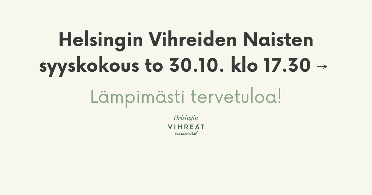 Lämpimästi tervetuloa myös HENNAn hallitukseen! Jos olet ikinä miettinyt, että haluaisit olla muuttamassa maailmaa, tehdä jotain suurta tai pientä – tule mukaan! Ensi vuoden hallitus suunnittelee mm. tulevia eduskuntavaaleja 😉 Julkaisemme lähempänä kokousta linkin hakemukselle, mutta jo nyt:, ota matalalla kynnyksellä yhteyttä: helsinginvihreatnaiset@vihreat.fi tai pj Anu Randén-Siippainen, anu.randens@gmail.com