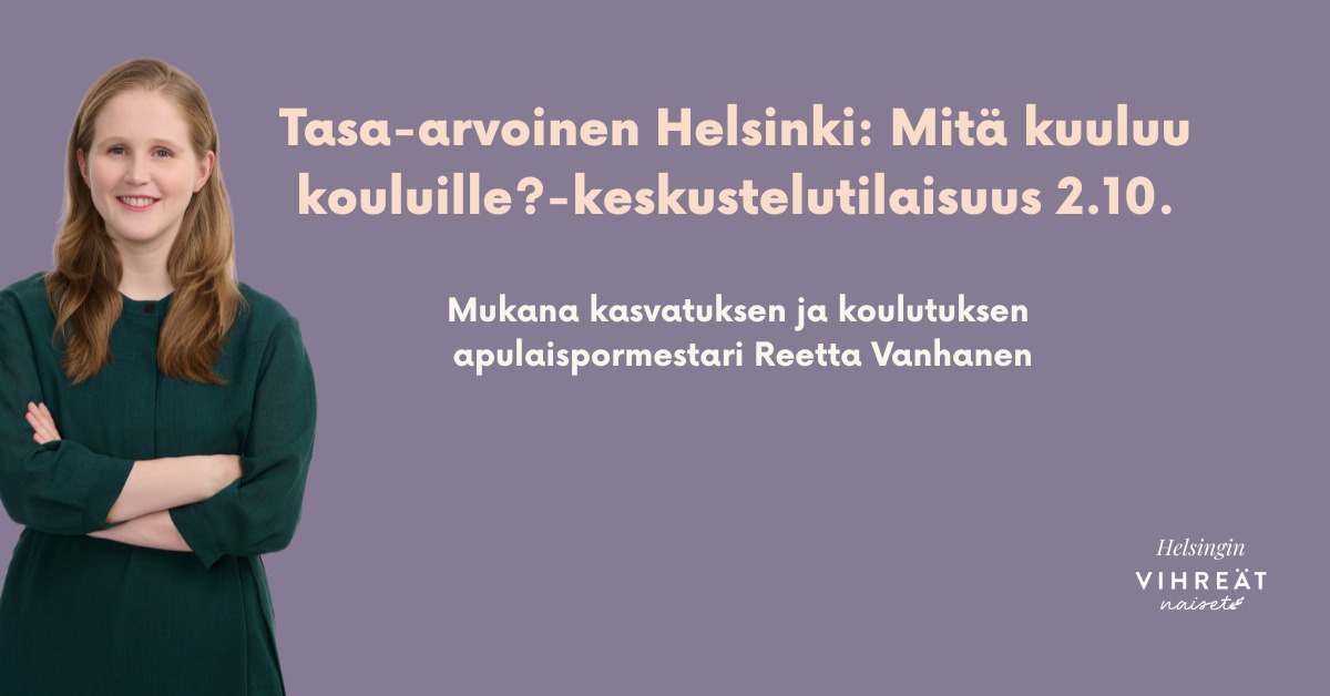 Tapahtumaan osallistuu Helsingin kasvatuksen ja koulutuksen apulaispormestari, meidän upea Reetta Vanhanen! Mukana on myös muita osaavia vihreitä keskustelijoita: kaupunginvaltuutettu, erityisopettaja Johanna Nuorteva sekä varavaltuutetut, opinto-ohjaaja Maria Aarnilinna ja luokanopettaja Joanna Lukkarila.