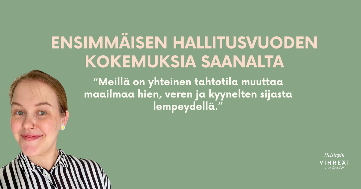 Vajaa vuosi sitten askelsin jännittyneenä Helsingin Vihreiden Naisten syyskokoukseen. Sen myötä olen tämän vuoden istunut HENNA:n hallituksessa ja nyt harmittelen vain sitä, etten rohkaistunut lähtemään toimintaan aikaisemmin. Jos sinäkin puntaroit hallitukseen hakemista mutta mietit, pärjäätkö ja ehditkö, sanon sinulle tämän: jos jaat HENNA:n vihreän ja feministisen arvomaailman ja haluat tehdä edes jotakin pientä paremman Helsingin, Suomen ja maailman eteen, kannattaa ehdottomasti hakea!